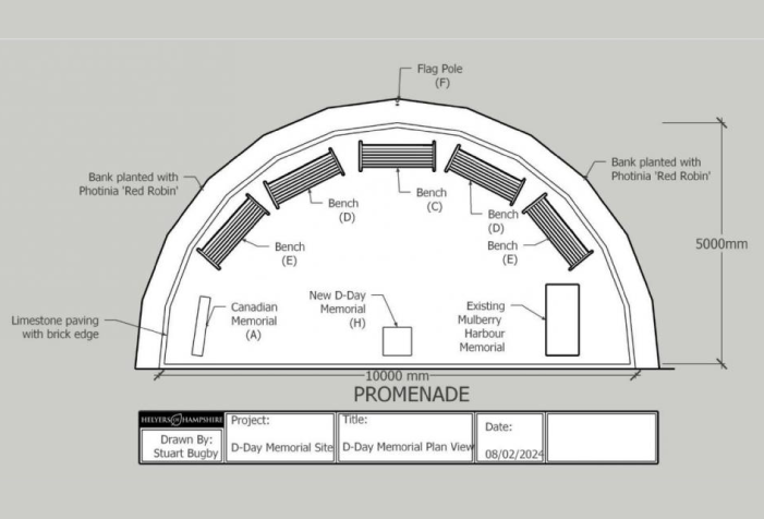 The Memorial will be located near the Mulberry Harbour Memorial Stone alongside Stokes Bay Sailing Club. The Memorial will be a semi-circle in shape, containing 5 benches which reflect the 5 beaches in Normandy, linking Gosport directly to where those who left, arrived. Benches will provide the opportunity to sit and quietly reflect looking out over the Solent where so many thousands departed from. The whole arrangement will be encircled across the back with Red Robin bushes which will provide a windbreak as a native robust shrub hedge.